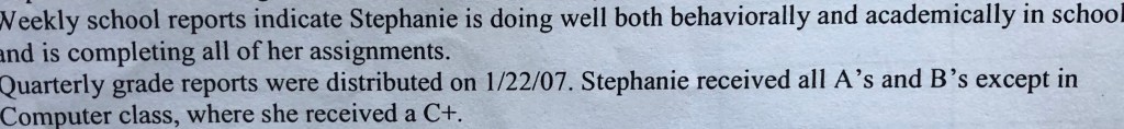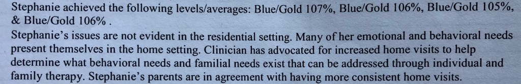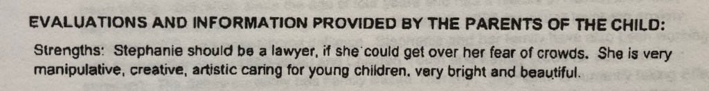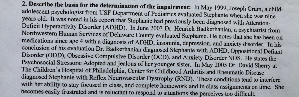 Some of the diagnoses are listed in the attached picture, a diagnosis that was not included was that of RAD. Although never formally diagnosed with this, it is tossed around in all of the paperwork that I have read. This picture was taken from an IEP but it was the best way to capture the history of my diagnoses. It is also important to note that all of the “issues” I had was reported by my adoptive parents but was not seen in real time by professionals. This is also documented and there are a few different photo excerpts that I added to show this.