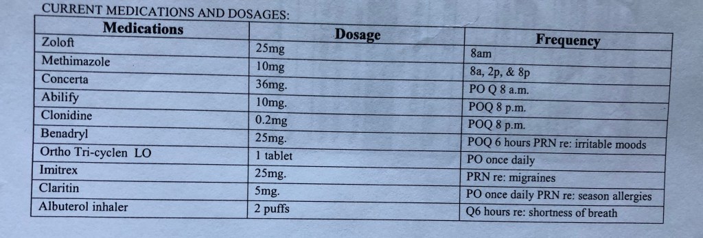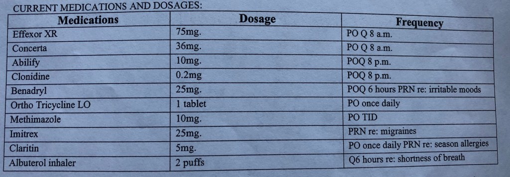 The other two pictures attached are of the medication that I was prescribed. This was a snapshot of a time period, but I was on medication virtually my entire childhood. This began shortly after I arrived in the house around a year of age. I apparently would not sleep and would cry a lot. Taking out the fact that I was uprooted and taken from the parents I had known and placed into a new home. No one seemed to think this could be grief and loss, fear and panic at bedtime. We talk of routines with children. I was confused and crying for help. Before the age of four I was placed on sleeping medication for “insomnia”. I had never had issues sleeping before in previous placements. At the age of 17.5, I left my adoptive home and stopped all medication. I was fine, and was able to function. This is an interesting fact because the many of the disorders I was diagnosed with would not simply disappear and in fact, I should have gone into crisis after stopping medication.